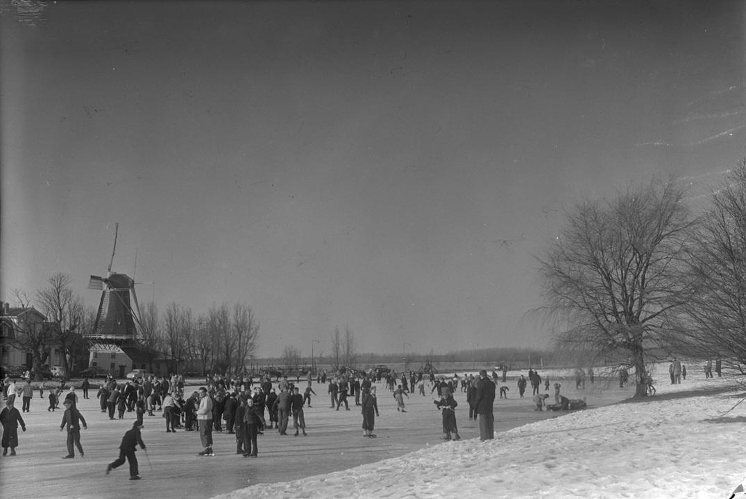 Schaatsen op een vijver naast snuifmolen de Lelie, 1955. Op de achtergrond de Kralingse Plas