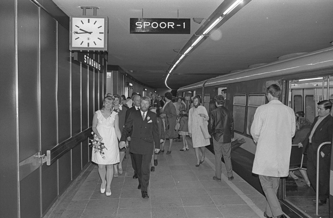 (Van een onzer verslaggevers) Voor het eerst is in Rotterdam een bruidspaar In de metro naar het stadhuis gereden. Voor deze primeur is vanmorgen gezorgd door de 22-jarige bankwerker M. J. van der Zee en de 20-jarige kleuterleidster G. L. de Wreede. Waarom zij de metro boven trouwauto’s verkozen? βIk kan echt niet tegen autorijden,” zei het charmante bruidje. Mej. de Wreede (nu mevrouw Van der Zee) woont aan de Putselaan 191a. Vandaar is het twee minuten lopen naar het metrostation Maashaven. Het goot en daarom kwamen het bruidspaar en hun gasten in plastic gehuld bij dit station aan.