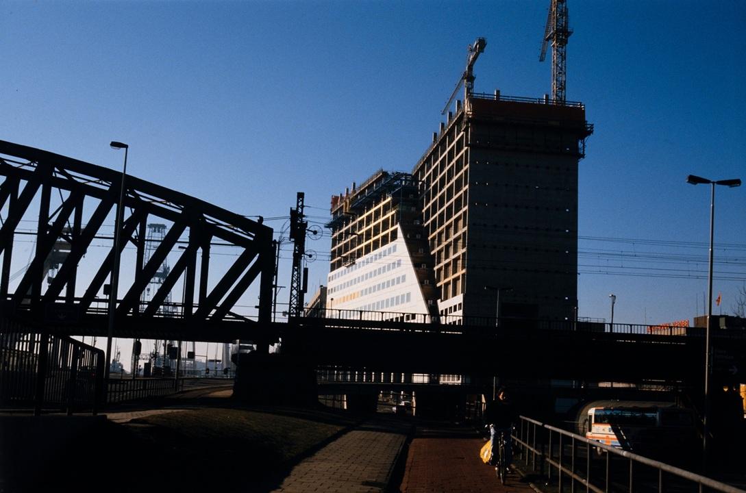 De bouw van de Willemswerf met op de voorgrond de Willemsspoorbrug, 31 januari 1987.