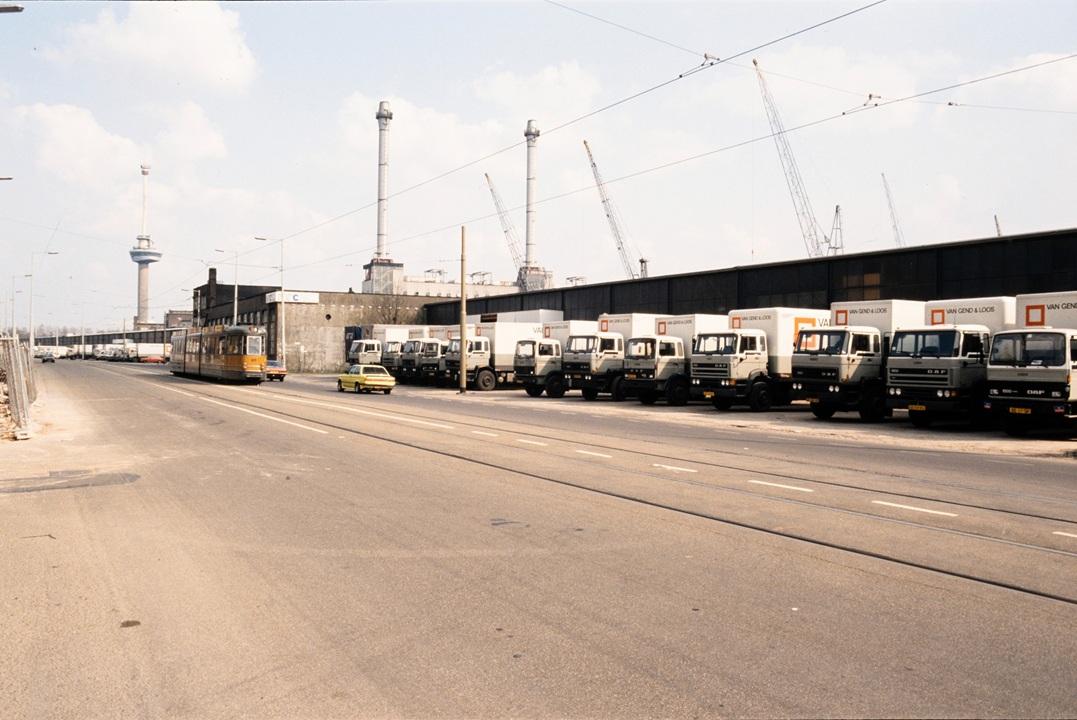 Er rijdt een tram over de Westzeedijk langs geparkeerde vrachtwagens van Van Gend & Loos, 2 april 1988 . In de verte de Euromast. De foto is vanaf de Oostkousdijk gemaakt.