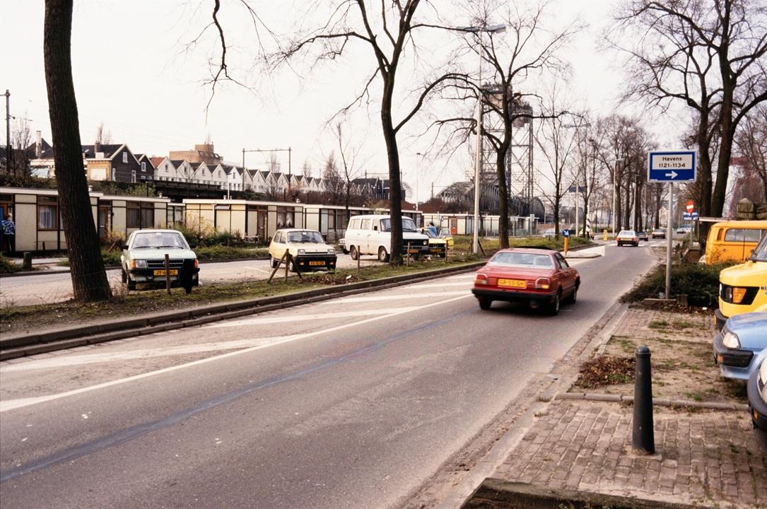 Zicht op de Oranjeboomstraat vanaf de Stampioenstraat met links noodwoningen, de spoorlijn, 1987