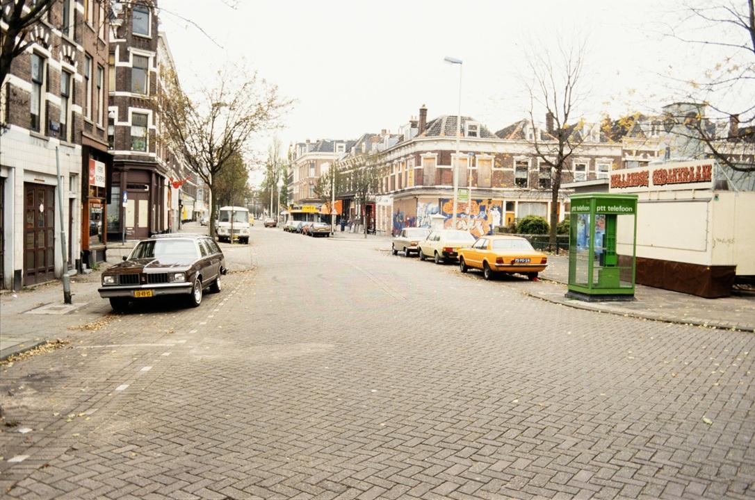Zicht op de Benthuizerstraat met links, op de hoek met de Schommelstraat, koffiehuis ‘De Klaver’, 15 november 1987. Op het Pijnackerplein rechts staan een ‘Hollandse gebakkraam’ en een PTT-telefooncel.