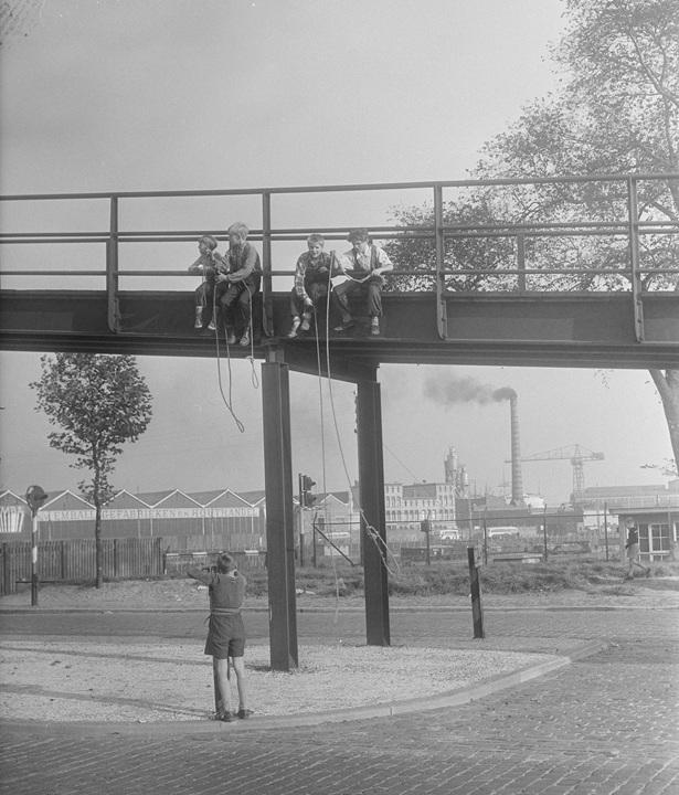 Kinderen spelen met touwen op de voetgangersbrug over de goederenspoorbaan bij de 2e Rosestraat, 12 oktober 1955. Op de achtergrond de NV Emballagefabrieken en Houthandel (EMBA).