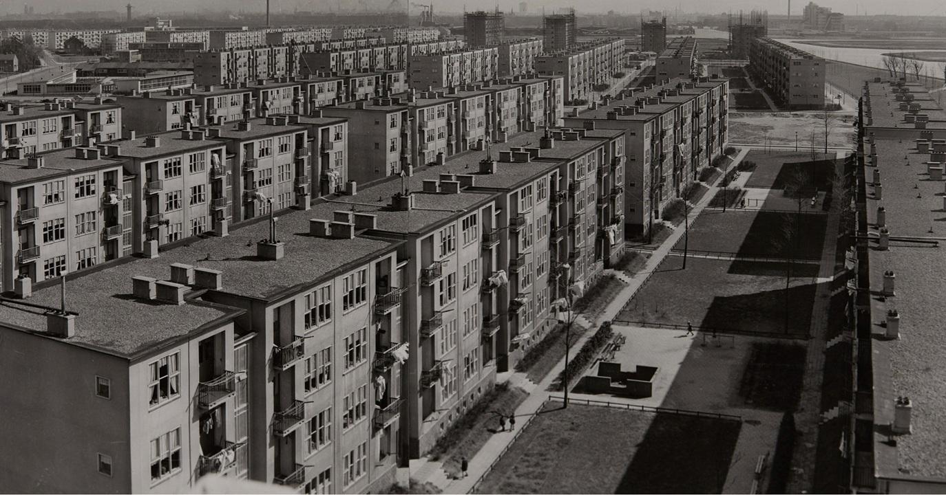 Overzicht van nieuwe flatwoningen in de wijk Kleinpolder in Overschie, 1954