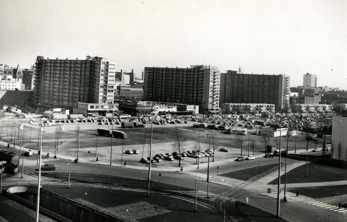 Het parkeerterrein tussen de Karel Doormanstraat en het Kruisplein met op de voorgrond een stukje autotunnel van het Weena, 1952.