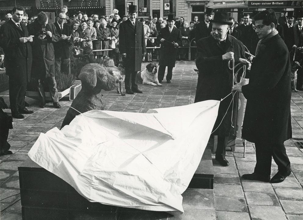 Het bronzen beeldje Fikkie, van de beeldhouwster J. Noorlander-Simàk, wordt op het Hermesplantsoen door Mr. dr. K.P. van der Mandele onthuld, 16 november 1963.