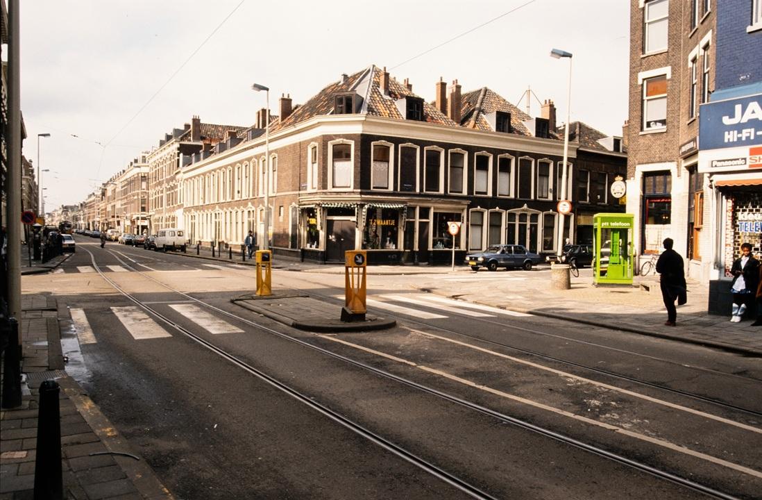 Op de hoek tussen de Zaagmolendrift en het Zwaanshals (rechts) staat een telefooncel met daartegenover ’t Zwaantje, 20 maart 1988. De straat rechtdoor is de Zaagmolenstraat.
