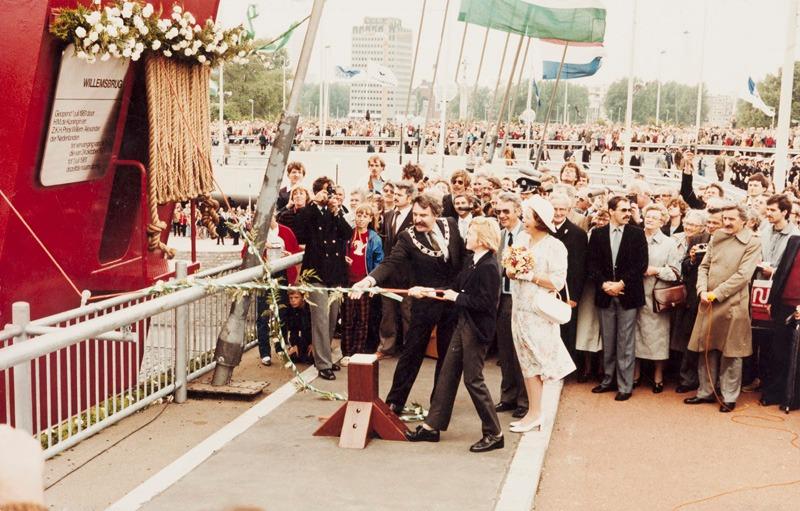 De opening van de Willemsbrug met Koningin Beatrix, prins Willem Alexander en burgemeester André van der Louw, 1981
