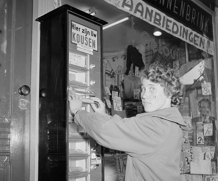Een primeur voor Rotterdam en een uitkomst voor de dames, die plotseling βn ladder in haar laatste paar nylons halen. Dat is de kousenautomaat, die de manufacturenwinkel ββt Getouwβ in de 1e Middellandstraat liet aanbrengen. Mevrouw W. van Straten uit de Groeninxstr. 16a, was een van de eersten die van dit technische modesnufje profiteerden.