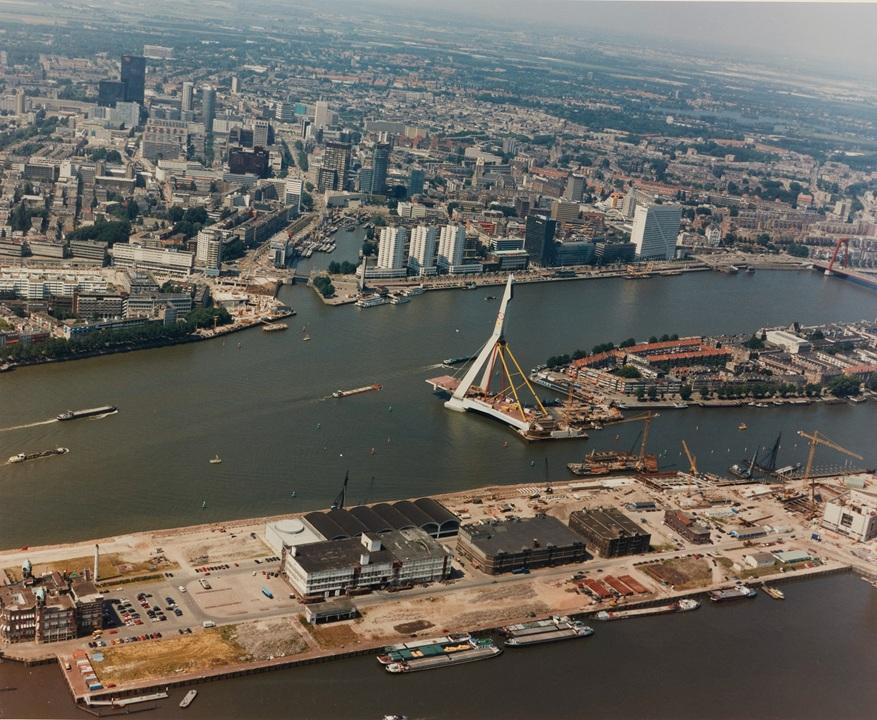 De bouw van de Erasmusbrug met op de voorgrond een deel van de Kop van Zuid, 1995.
