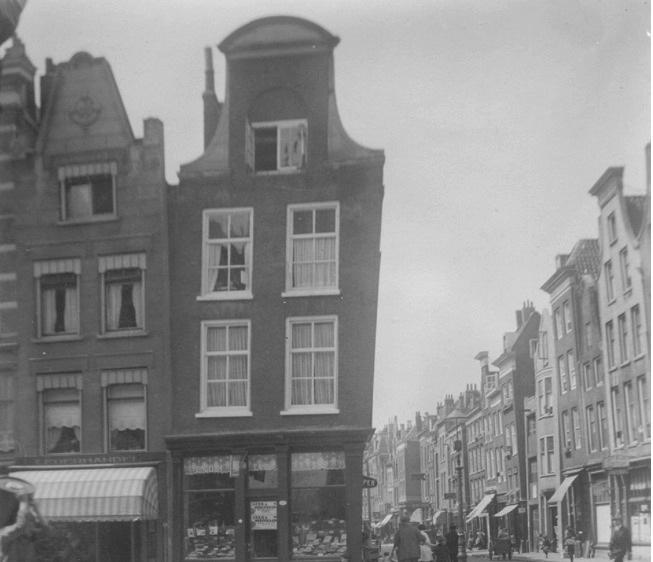 Vanuit de Van Spaanstraat kijk je de Breedestraat in, 1928. De panden waar je op kijkt staan aan de Goudsewagenstraat.
