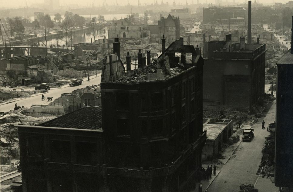 Zicht op de verwoeste omgeving van de Leuvehaven, Schiedamsedijk en Baan na het bombardement van 14 mei 1940. Opdat we nooit vergeten.