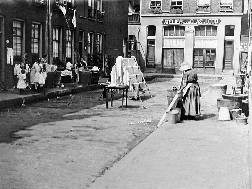 Gezicht op huizen van een hofje in de Warmoeziersstraat tussen Jonker Fransstraat en Meermanstraat, 1908