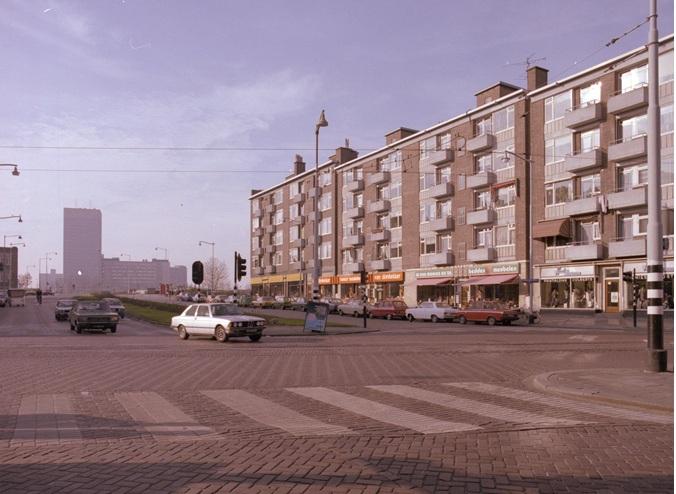 De Admiraal de Ruyterweg bij de kruising met de Jonker Fransstraat, 1978. Op de achtergrond het Shellgebouw.