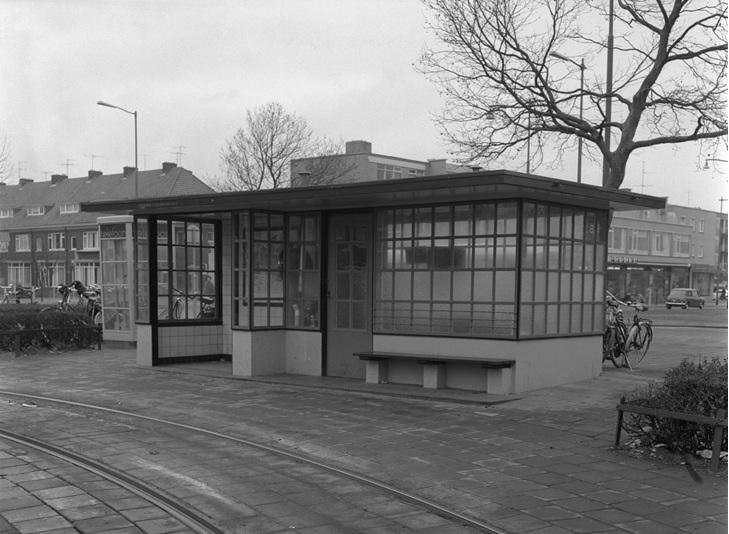 Een tramhuisje van lijn 14 van de RET aan het eind van de Burgemeester F.H. van Kempensingel en Molenlaan, 1965