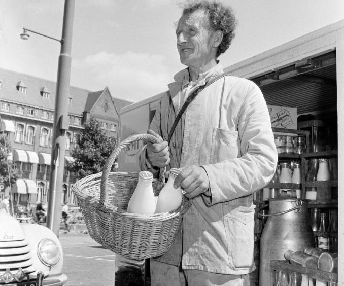 Melkbezorger van de RMI, J. van Kwaawegen, staat met een mand met flessen melk bij zijn wagen op de Schiekade, 1956.