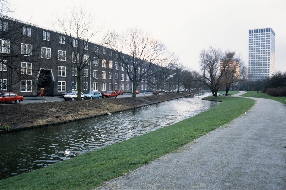 Woningen aan de Spaansebocht ter hoogte van de Potgieterstraat, 1 maart 1988. Rechts een toren van de Europointgebouwen.