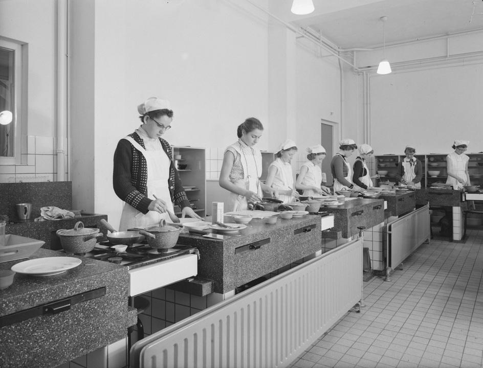 Leerlingen van de Christelijke Huishoudschool aan de Roerdomplaan maken eten klaar in een keuken, 1958