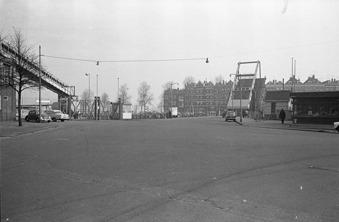 De openstaande Nassaubrug in de wijk Feijenoord, gezien vanuit de Roentgenstraat, 1965