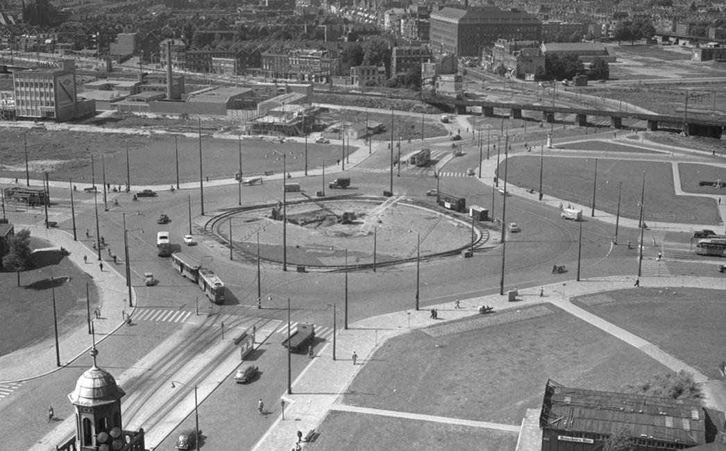 Het Hofplein vanaf de toren van het stadhuis, 21 juni 1954. Een dragline is bezig met het graven van de vijver van de fontein.