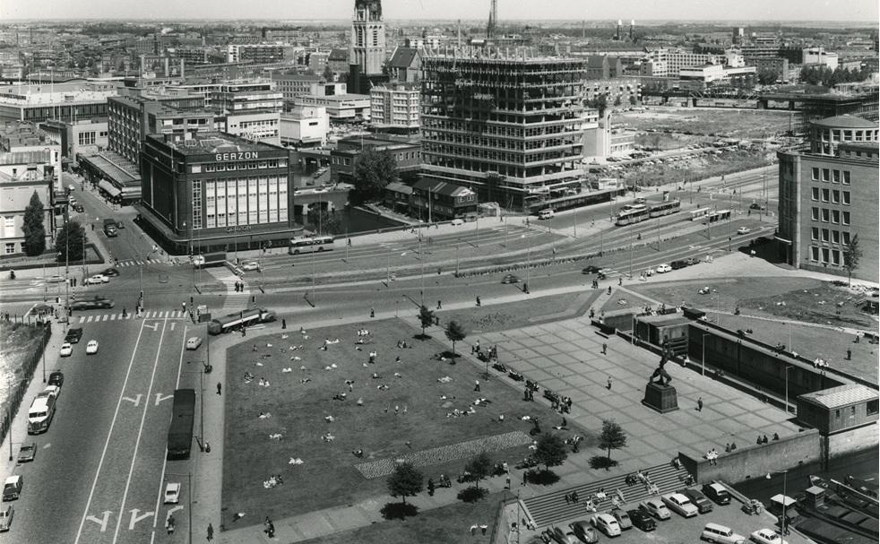 Overzicht van het Plein 1940 met het monument de verwoeste stad van de beeldhouwer Ossip Zadkine, 1961