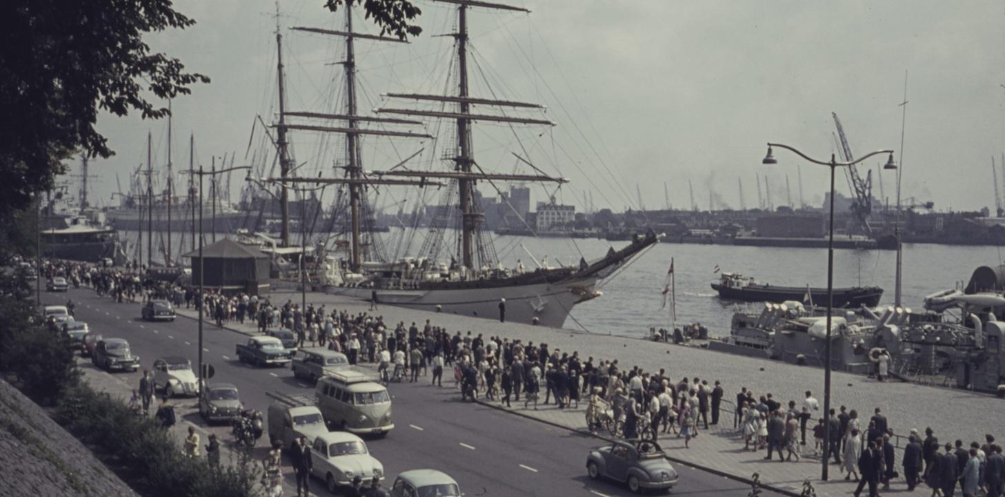 Zicht vanaf de Heuvel op de Parkkade met publiek en zeilschepen ter gelegenheid van de Tall Ships Race, 1962