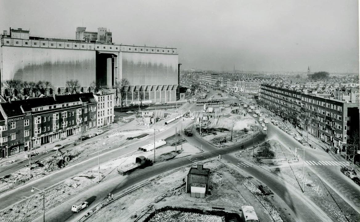 Beginwerkzaamheden voor de aanleg van de metro bij de Dordtselaan en de Mijnsherenlaan, 1963. Links de Graansilo van de N.V. Graansilo Maatschappij.Β