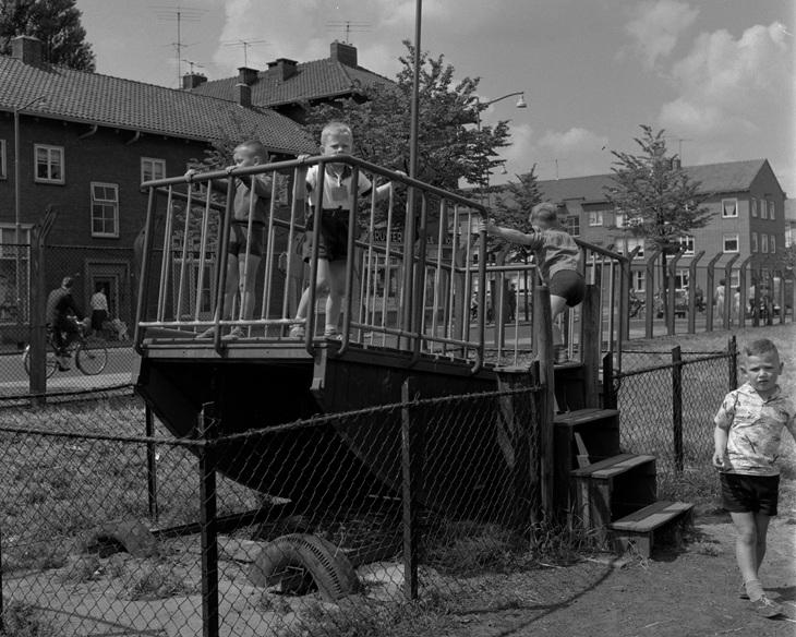 Kinderen in een speeltuintje aan de Gruttostraat met op de achtergrond rechts de Dorpsweg, 1961