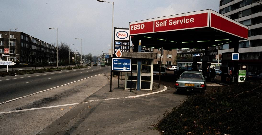 De Statenweg met rechts aan het Bentinckplein een tankstation van Esso, 1988
