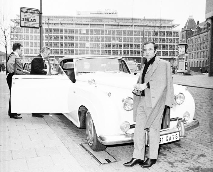 De Franse zanger Charles Aznavour staat voor een auto bij de hoofdingang van het Hilton aan de Kruiskade,1967