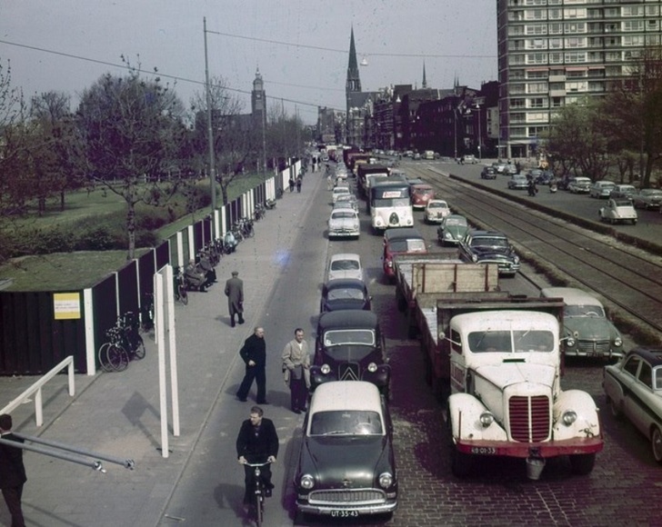 De Westzeedijk in april 1960. We kijken richting Vasteland. Rechts de Sint Ignatiuskerk en links de Nieuwe Zuiderkerk.