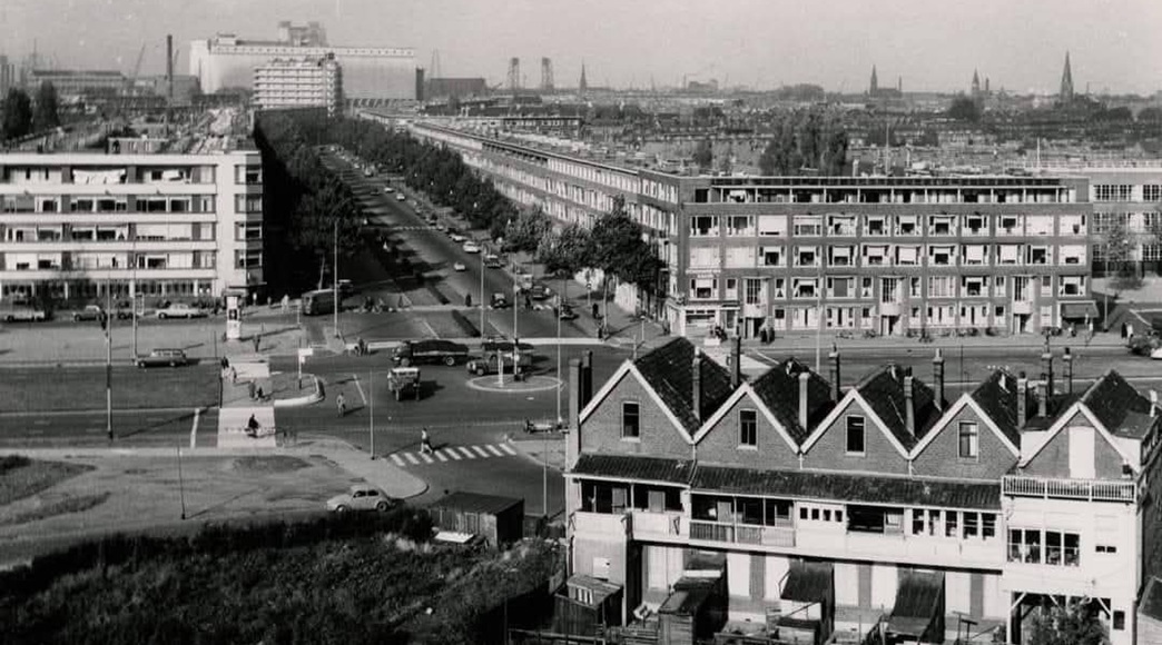 Overzicht vanaf het Verzamelgebouw Zuid met in het midden de Dordtselaan en op de achtergrond de Graansilo aan de Maashaven, 1959