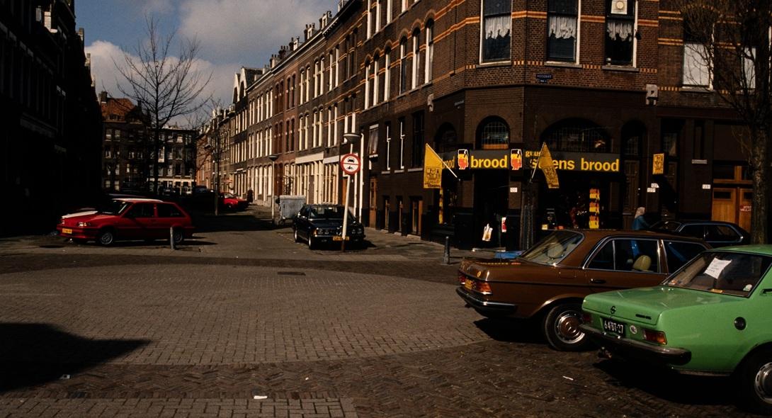 De Opzoomerstraat gezien vanaf de Hooidrift, 1988. Op de hoek zit bakkerij Guus Steens Brood