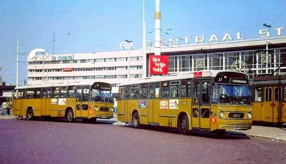 Bussen van lijn 37 op het Stationsplein, 1974. De bussen zijn van het merk Leyland-Panther.