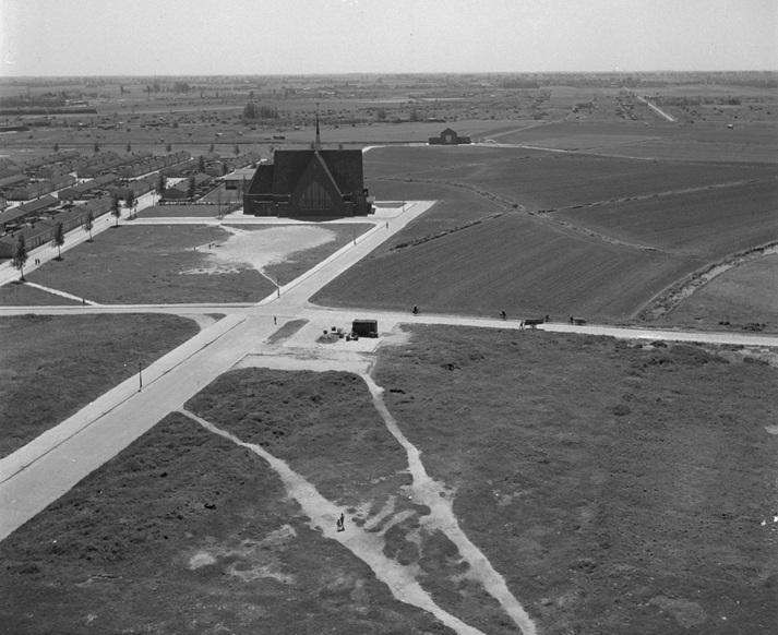 Blik op Zuid vanaf het flatgebouw aan het Zuidplein, juni 1951. De kerk is de Nieuwe Kerk van Charlois. Achter de kerk staat het gemaal ter hoogte van de Kromme Zandweg, de latere Zuiderparkweg. Nu staat dit gemaal voor de ingang van Ahoy. Links het Brabants Dorp.