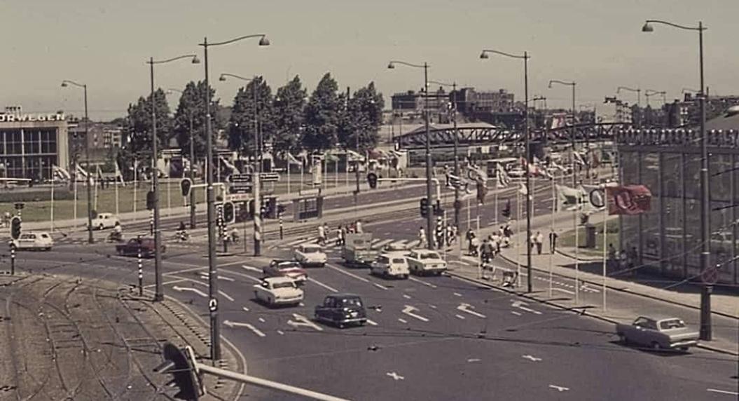 Zicht vanuit de kabelbaan van C70 op het Hofplein en Pompenburg, 1970. Rechts Bristol