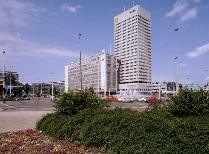 Het Hofplein met in het midden de fontein en daarachter het Shellgebouw, 1981