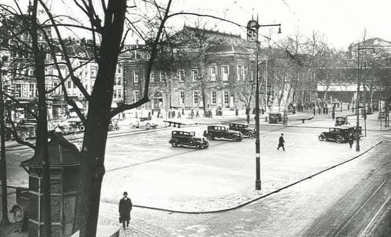 Gezicht op het Beursplein met in het midden de Beurs en rechts op de achtergrond Station Beurs, 1931
