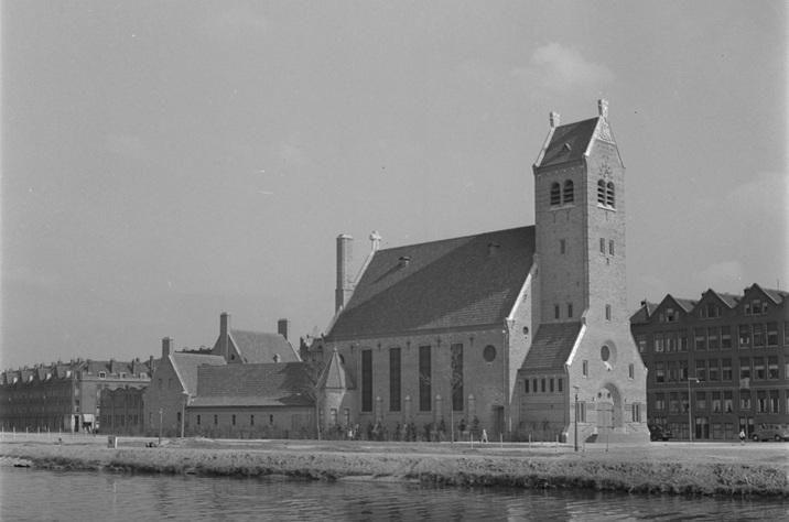 De Lutherse Andreaskerk aan de Heer Vrankestraat met op de voorgrond het Noorderkanaal en de Gordelweg, 1950