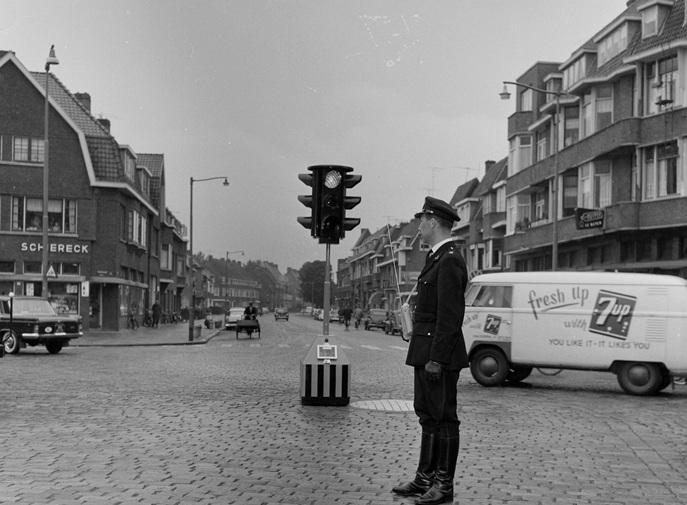 Een mobiel stoplicht en verkeersagent J. Bol bij de Kleiweg, Uitweg en de Rozenlaan. In het midden de Kleiweg, 1960