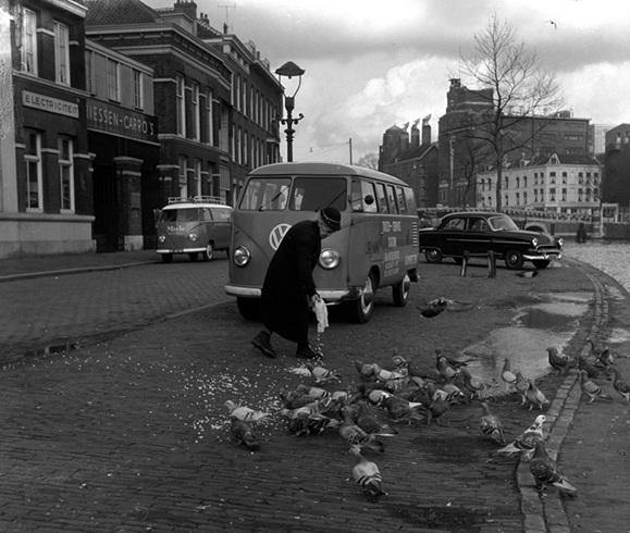 Hilda Hofman voert duiven aan de Rechter Rottekade, 1958
