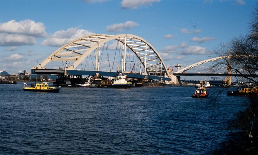 De tweede Van Brienenoordbrug wordt naar zijn plek gevaren, 1989