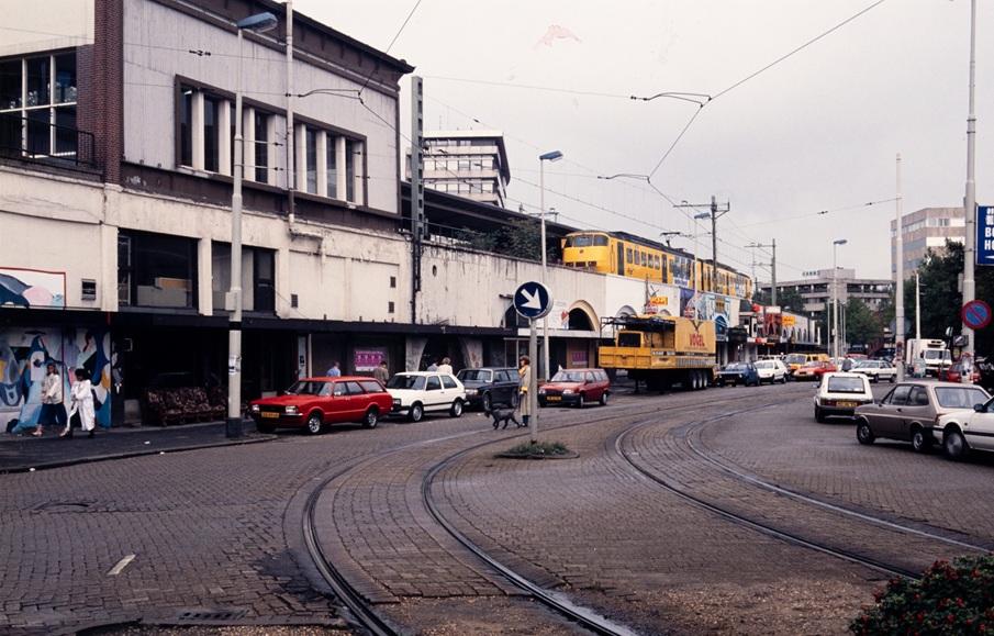 Een trein komt aan op station Hofplein, 1989. De foto is genomen vanaf de Katshoek.