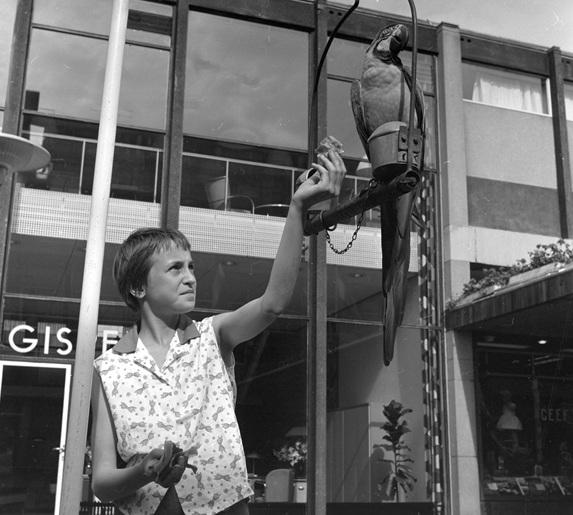 Op de Lijnbaan wordt een papegaai gevoerd, 1960