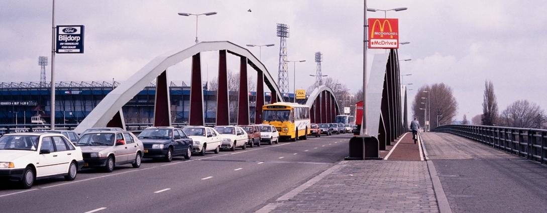 Het Stadionviaduct met op de achtergrond de Kuip, 1990