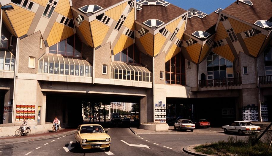 Een auto rijdt onder de Kubuswoningen door, 1989