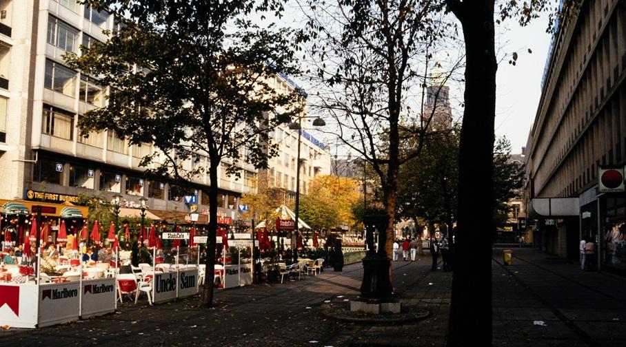 Het Stadhuisplein met onder andere het Stadscafé, 1986