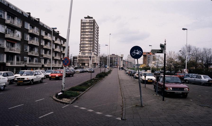 Zicht vanaf het Willemsplein met de Maastorenflat en de Stokkenbrug, 1989