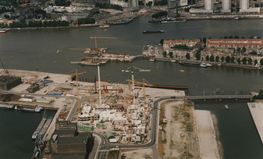 Ontwikkeling van de Kop van Zuid met bouwactiviteiten voor de Erasmusbrug en de bouw van de ‘Wilhelminahof’, 1994