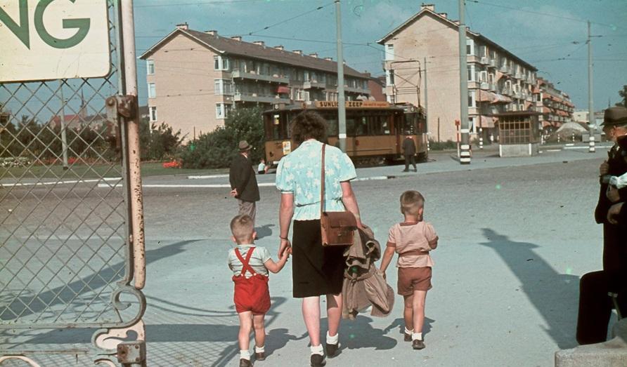 Moeder en kinderen verlaten Diergaarde Blijdorp bij de Van Aerssenlaan, 1944